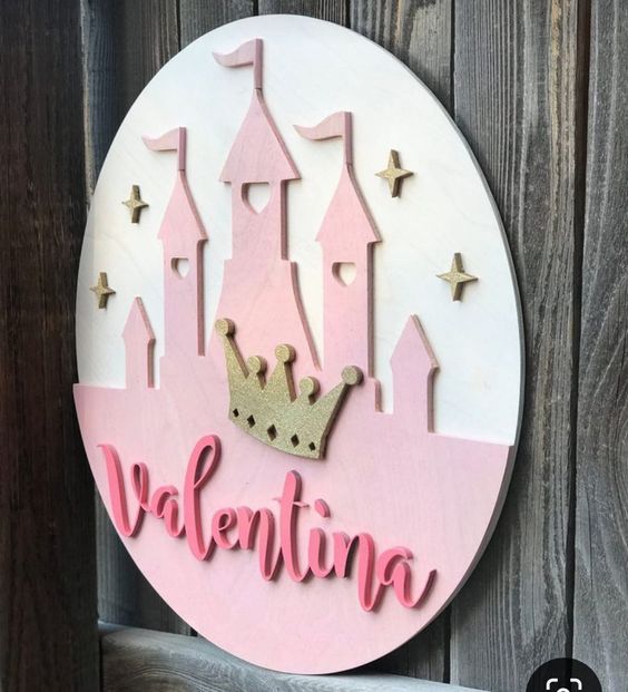An elegant 3D wooden plaque featuring a pink royal castle silhouette and a gold glitter crown.